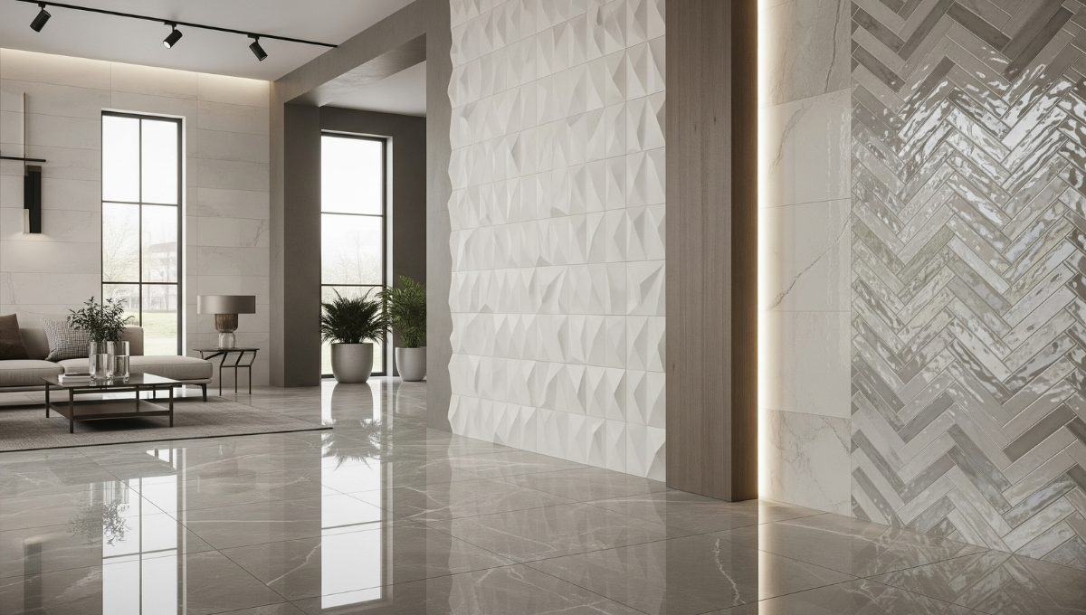 Polished ceramic finishes that add elegance to living rooms and hallways.